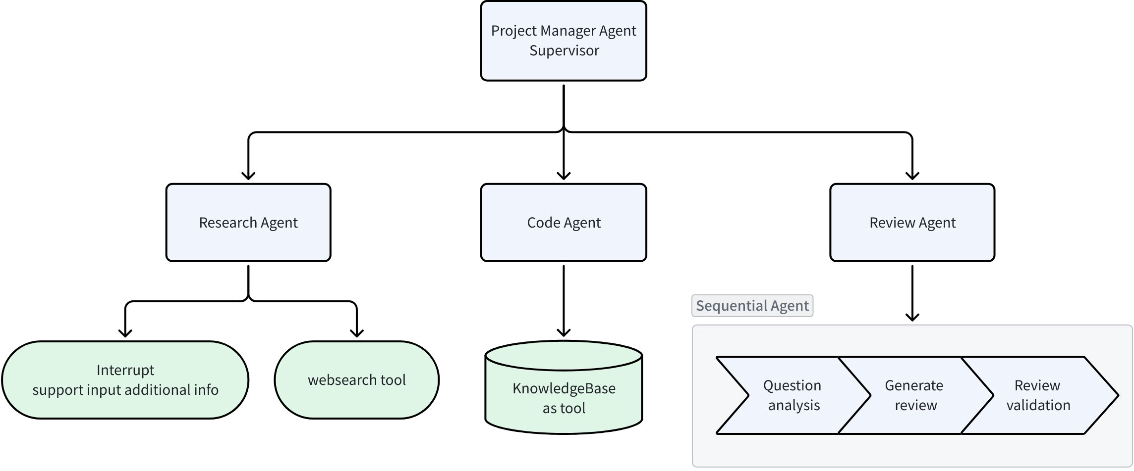 • ReviewAgent: sequential workflow (analyze → generate evaluation → validate) to review research/code and provide reasoned feedback